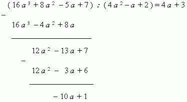 В результате получили частное 4a + 3 и остаток –10 a + 1.